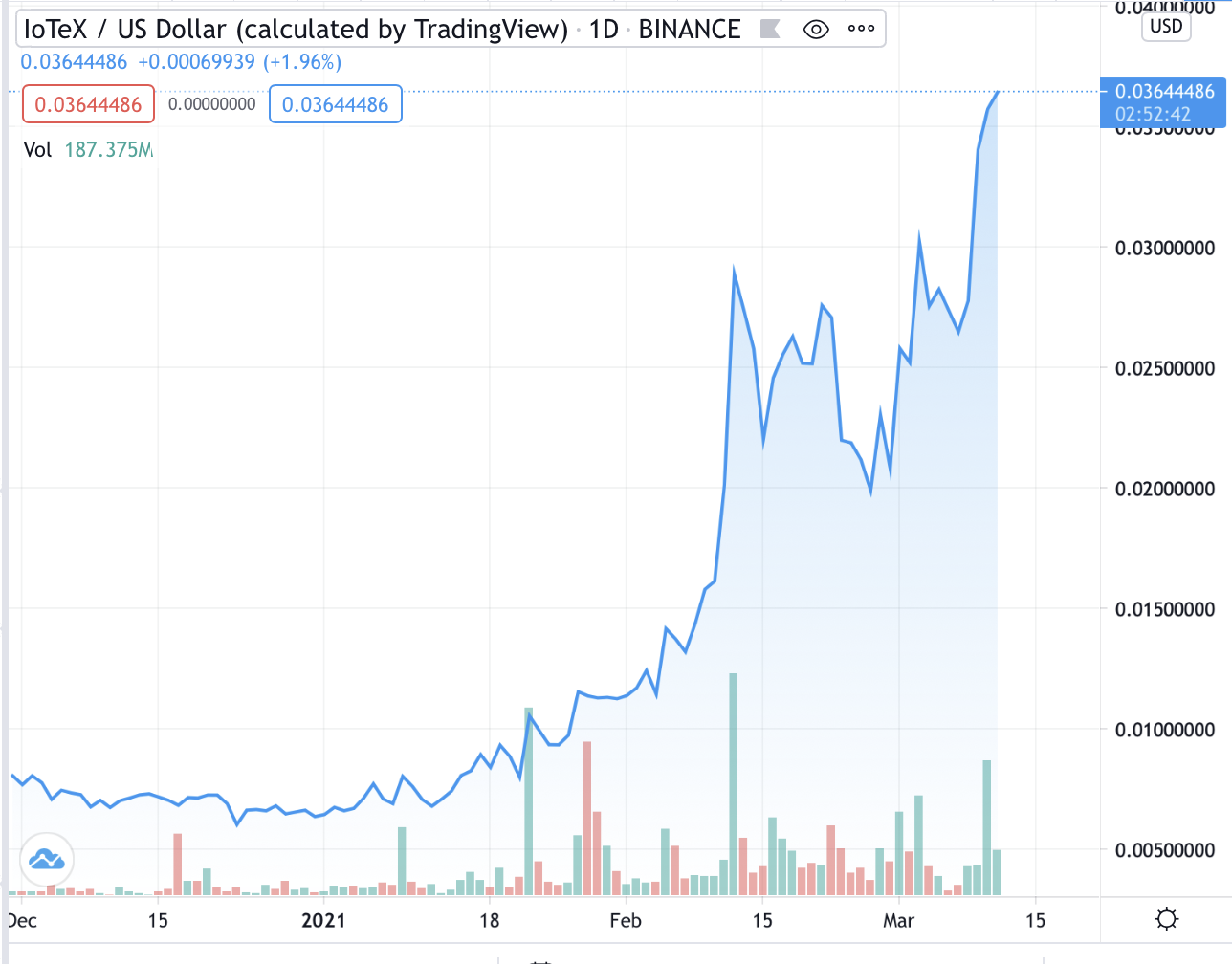 IoTex recently partnered with Amazon Web Services Partner Network (APN) to handle cloud storage and back-end technology for UCam in China. Since their collaboration, IoTex has been on fire and hit its all-time high on March 12.