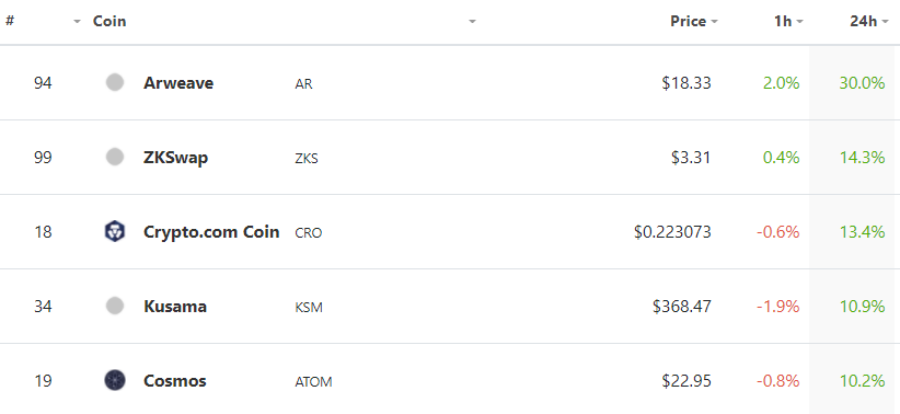 The biggest gainer on Thursday saw a new entrant break into the top 100. Arweave (AR) climbed an impressive 30% on Thursday to lay claim to the 94th spot on the list. The rest of the top gainers did not even manage half of what AR gained.