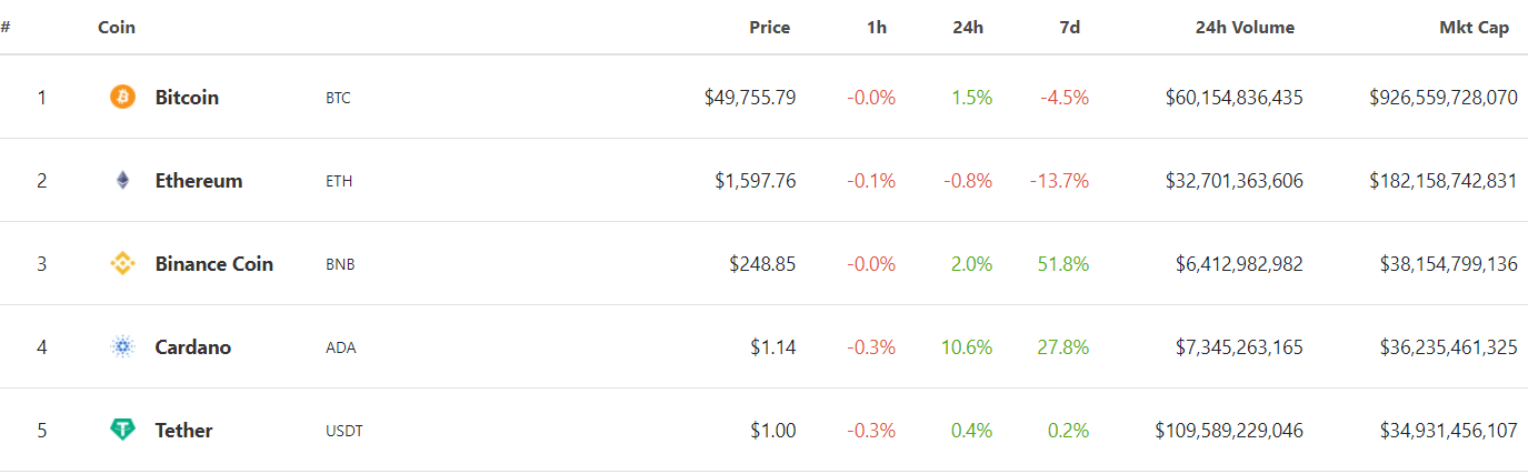 USDT fell down the pecking order as ADA continued its climb up the market cap list. The Charles Hoskinson-led project hit a new all-time high of $1.18 earlier this week.