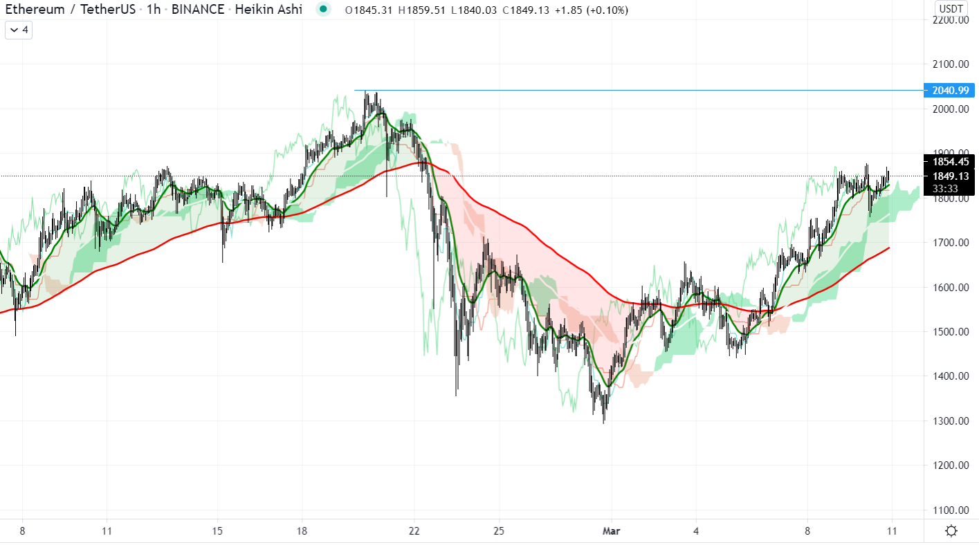 Ethereum also continues to look bullish as the second most popular cryptocurrency continues to move in unison with Bitcoin. ETH is now looking to target $1,900 as it rests less than $200 off of its all-time high. The crypto is expected to roll out some significant upgrades to the gas fee structure in the coming weeks that will likely see the price of Ethereum break the recent all-time high.Â