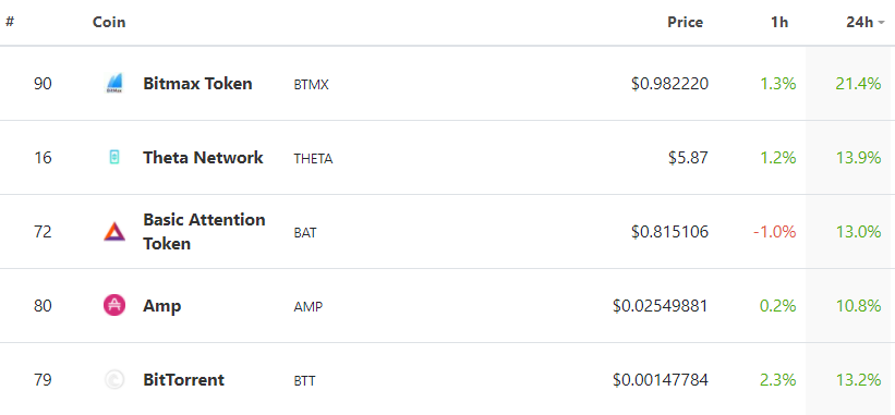 Following a week dominated by Chiliz (CHZ), the project finally saw some price correction as it dropped 10% on the day. The new top 100 biggest gainer went to a new top 100 entrant. Bitmax Token (BTMX) broke into the top 100 with a gain of over 21%. The exchange is not well known compared to some of its rivals, however the centralized exchange token now joins the likes of Binance, Huobi, and KuCoin in the top 100.Â