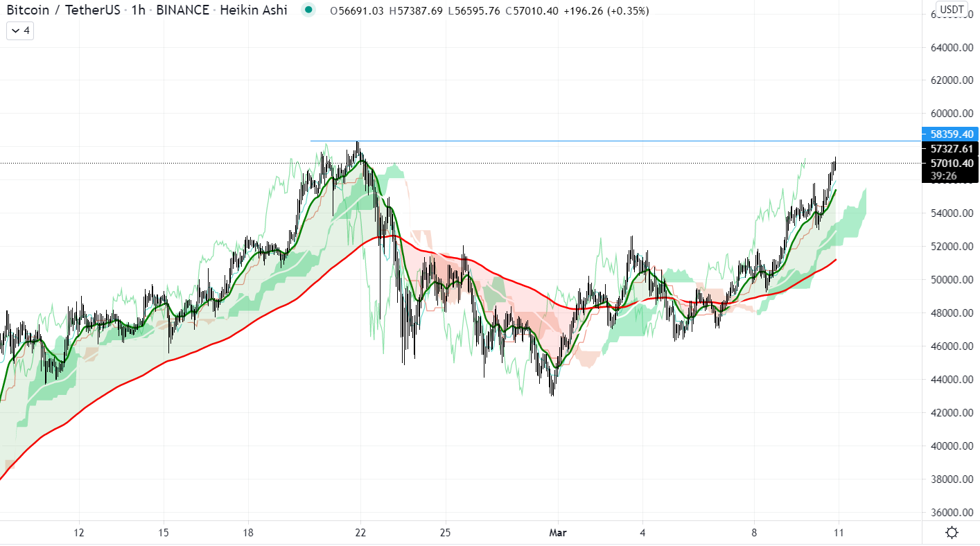 Bitcoin had yet another good day as the crypto pushed up to $57,350. The bullish momentum sees BTC continue its slow climb to the all-time high of around $58,350.