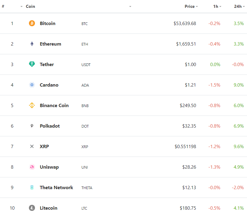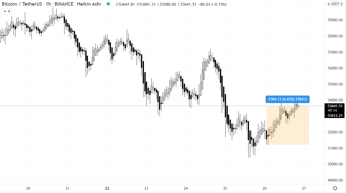 Following a tumultuous week for the crypto market, things finally appeared to be turning around on Friday. Thursday’s massive sell-off was greeted with green across the board on Friday. As bitcoin and the majority of altcoins, all gained on Friday. Friday will be the first day in one week that bitcoin could close bullish; after the last six days, all ended with bitcoin down. The price of bitcoin currently rests around $53,600 with a solid gain of 4.65% on Friday and going into the weekend.