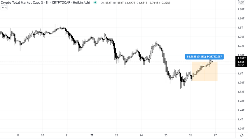 The increase in prices across the board saw the total market capitalization jump over 5% on Friday. While still off from the $1.81 trillion high, the market cap recovered from $1.5 trillion to over 1.65 trillion following the bullish day.