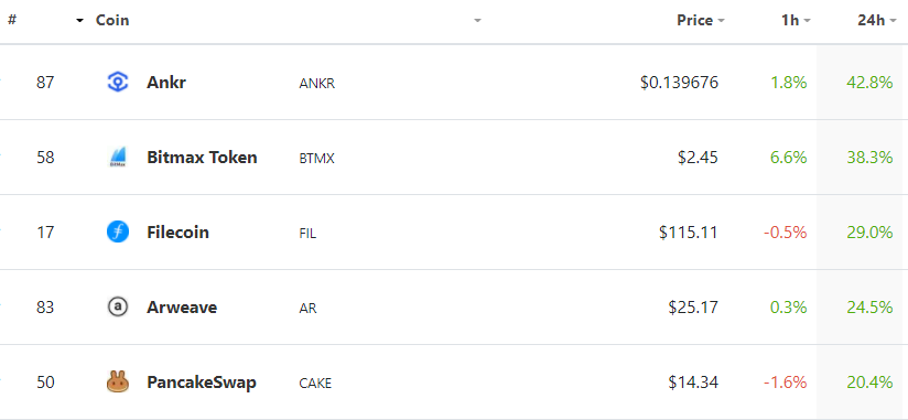 The top gainer’s list, on the other hand, was far more impressive. ANKR topped the list with a massive 42.8% price gain, while BTMX came in a close second with a 38.3% gain in price.