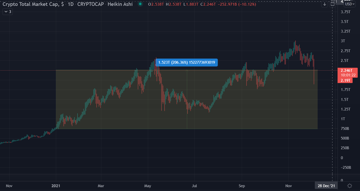 It should be noted that even though bitcoin has declined nearly 30% since it’s all-time high nearly one month ago, the overall market capitalization is still up 250% since the beginning of 2021.With bitcoin up over 150% since January. While corrections are expected, the likelihood of an extended bull run could have seen complacency in the market sentiment which led to over-extended long positions.