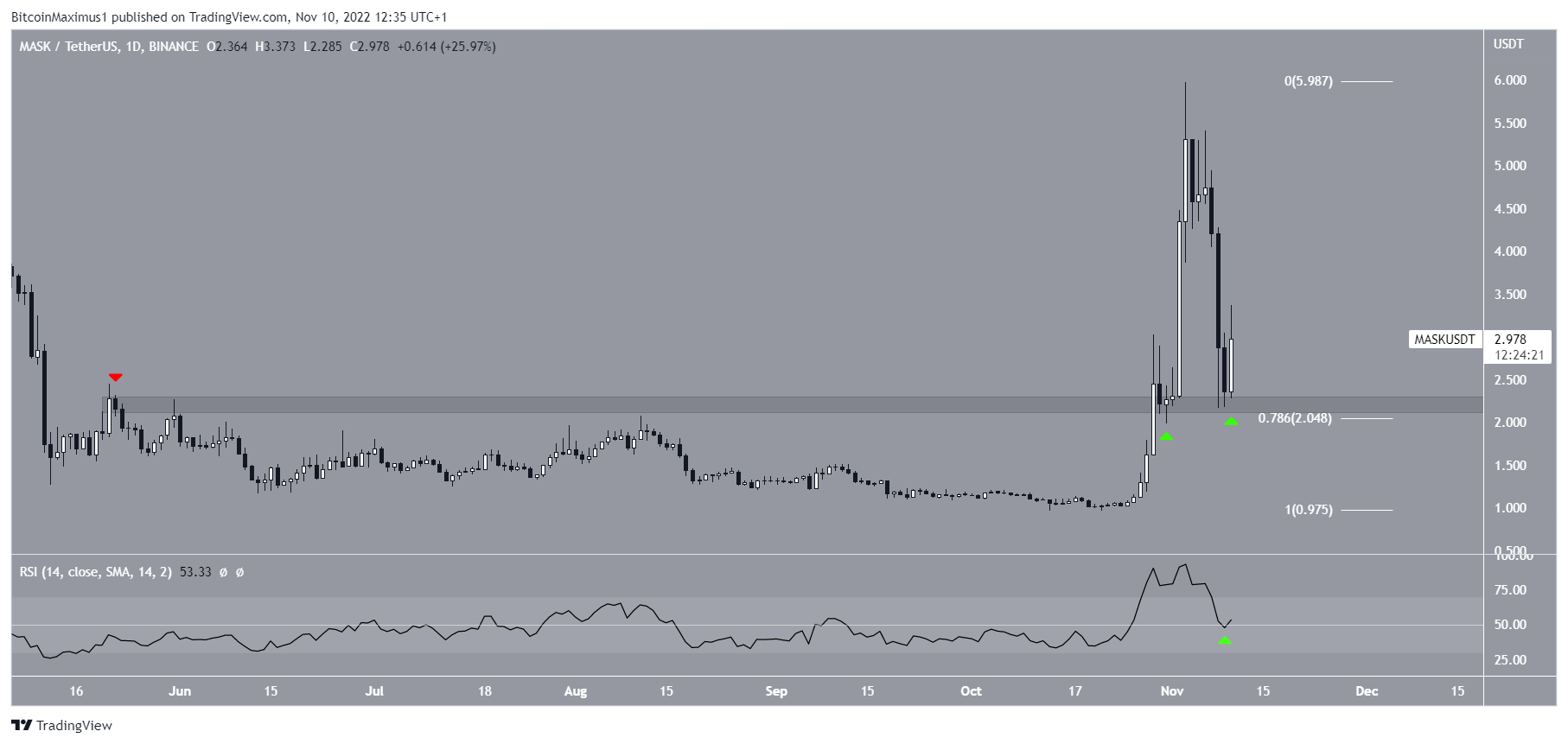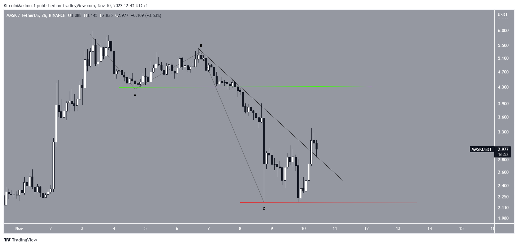 A technical analysis of the daily time frame shows that the Mask Network price has been decreasing since reaching a high of $5.98 on Nov. 3. The downward movement followed the rest of the crypto market and created of a long upper wick. So far, it has led to a low of $2.16.