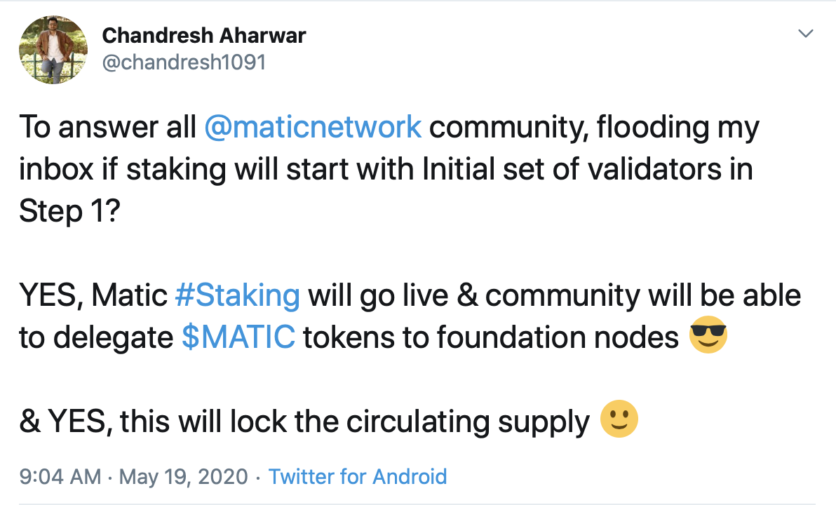 Matic’s marketing lead, Chandresh Aharwar, has confirmed that staking will commence with the first set of validators. There will be no delay.
