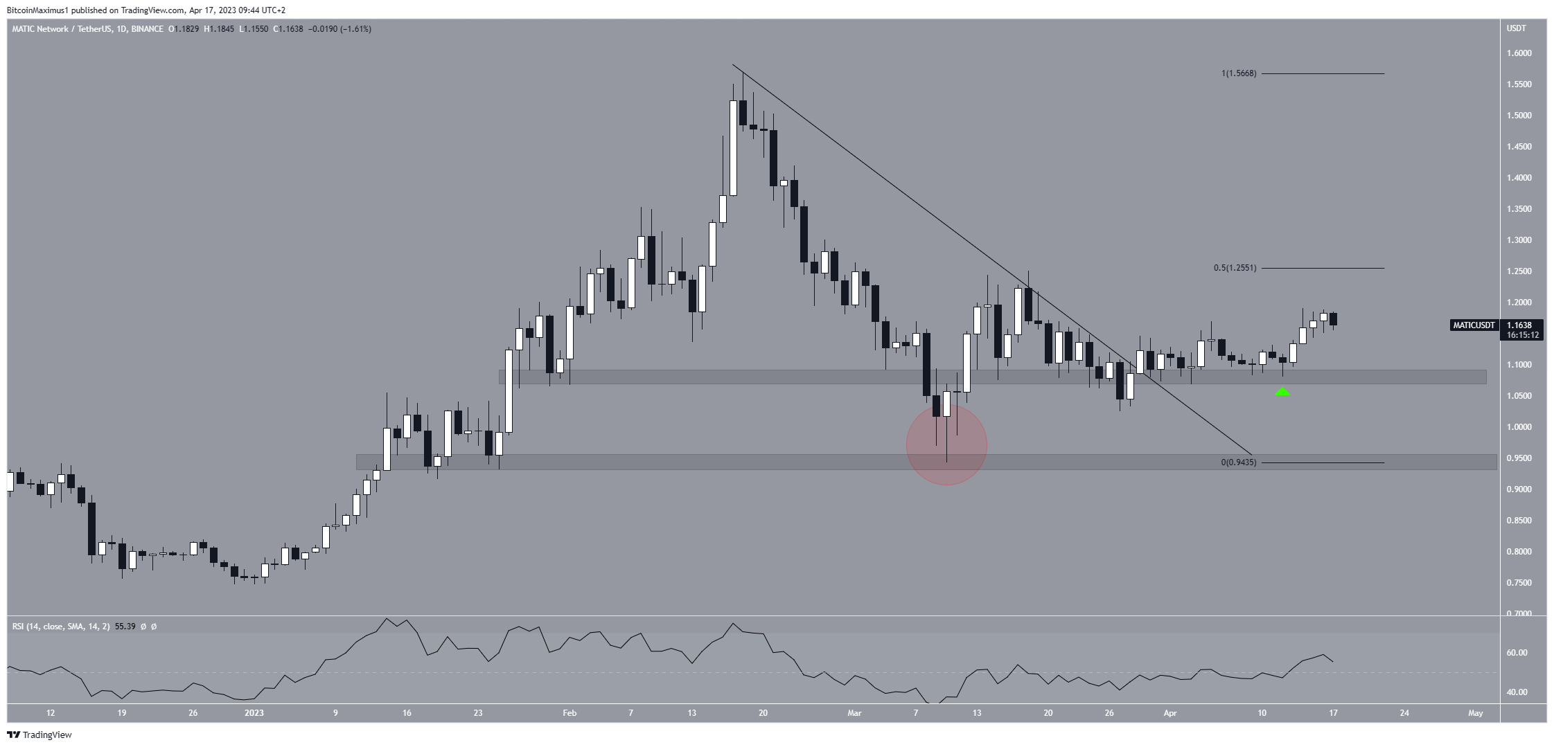 Nevertheless, MATIC created a higher low on April 12 (green icon), and the price has increased since. A higher low can be considered a bullish trend, as it represents the price of an asset reaching a low point that remains higher than the previous low point on the chart.