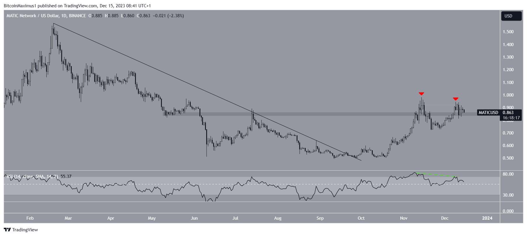 The Polygon (MATIC) price has fallen since November 14, creating a lower high on December 9.