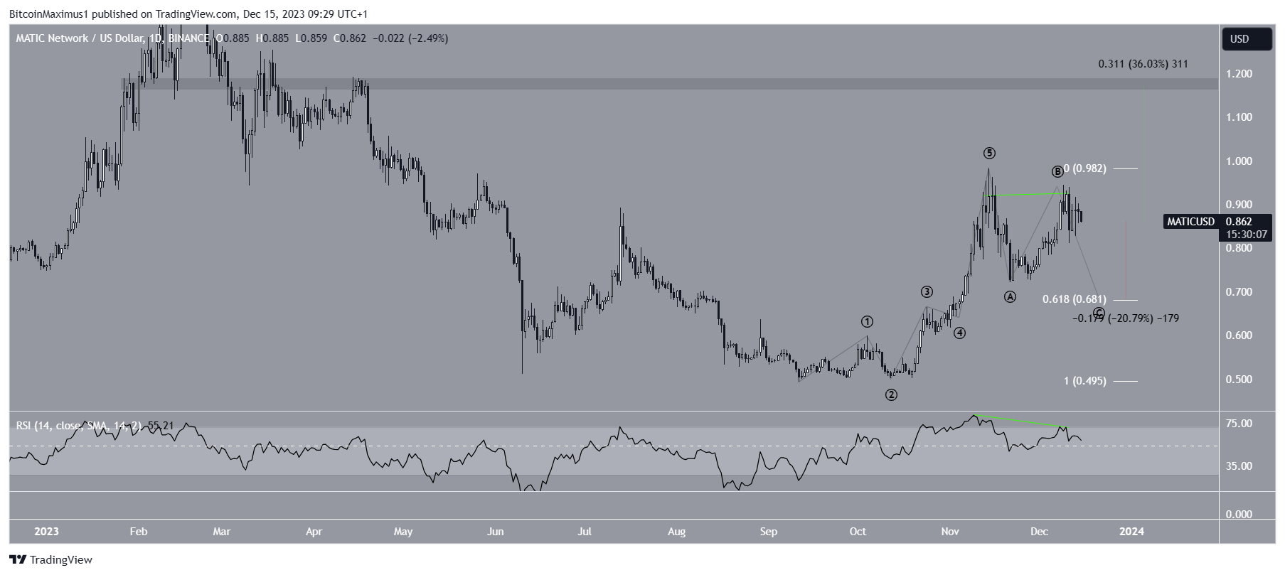 The most likely count suggests that the MATIC price completed a five-wave upward movement starting in September. Now, it is in the C wave of an A-B-C corrective structure. The bearish divergence in the daily RSI also supports this decrease.