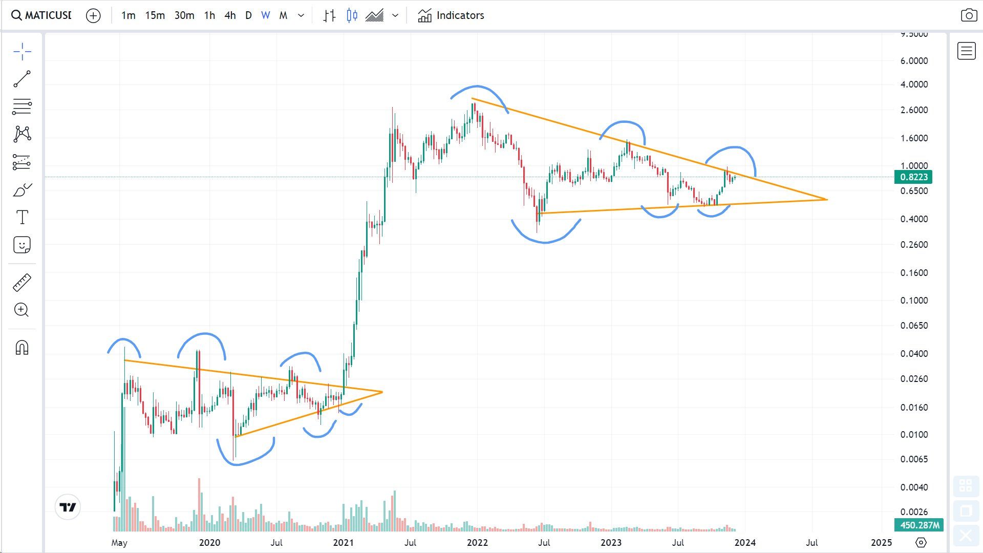 Dark Green tweeted a long-term symmetrical triangle. He suggested that the movement will be similar to that of 2021, when MATIC accelerated its increase after breaking out from a similar pattern.