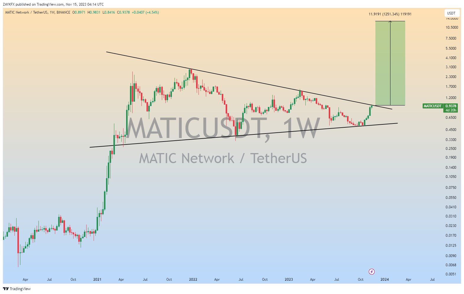 ZAYKCharts believes a long-term breakout from the current long-term pattern is likely and could lead to a new all-time high price. He stated that: