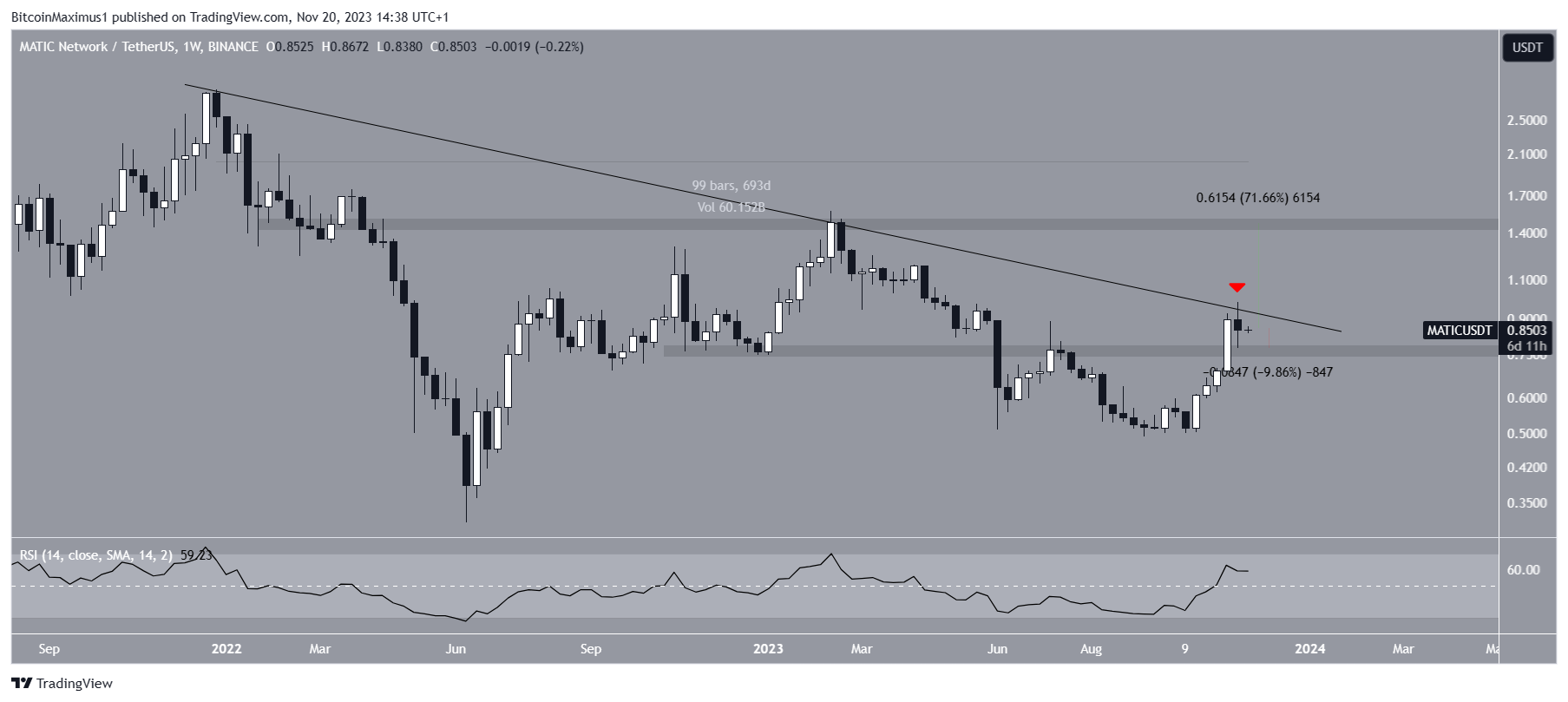 A look at the MATIC price decrease since the all-time high shows that the altcoin has followed a descending resistance for nearly 700 days since the all-time high.