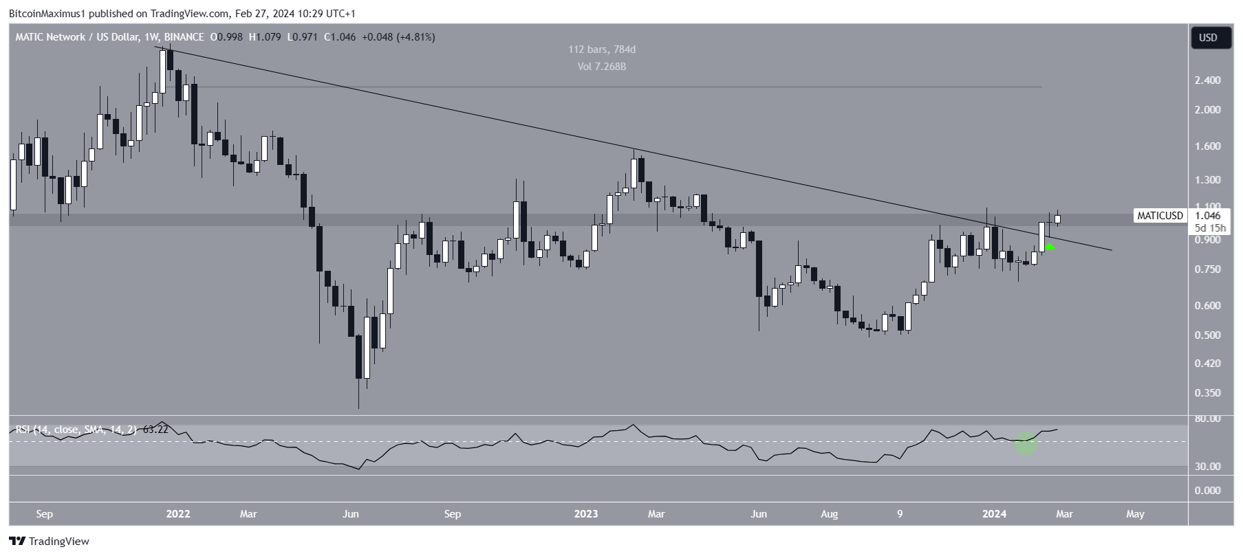 The weekly time frame technical analysis shows the MATIC price broke out from a 780-day descending resistance trend line two weeks ago. Before, the trend line had existed since the all-time high. Today, MATIC reached a high of $1.08, slightly below the December 2023 high.