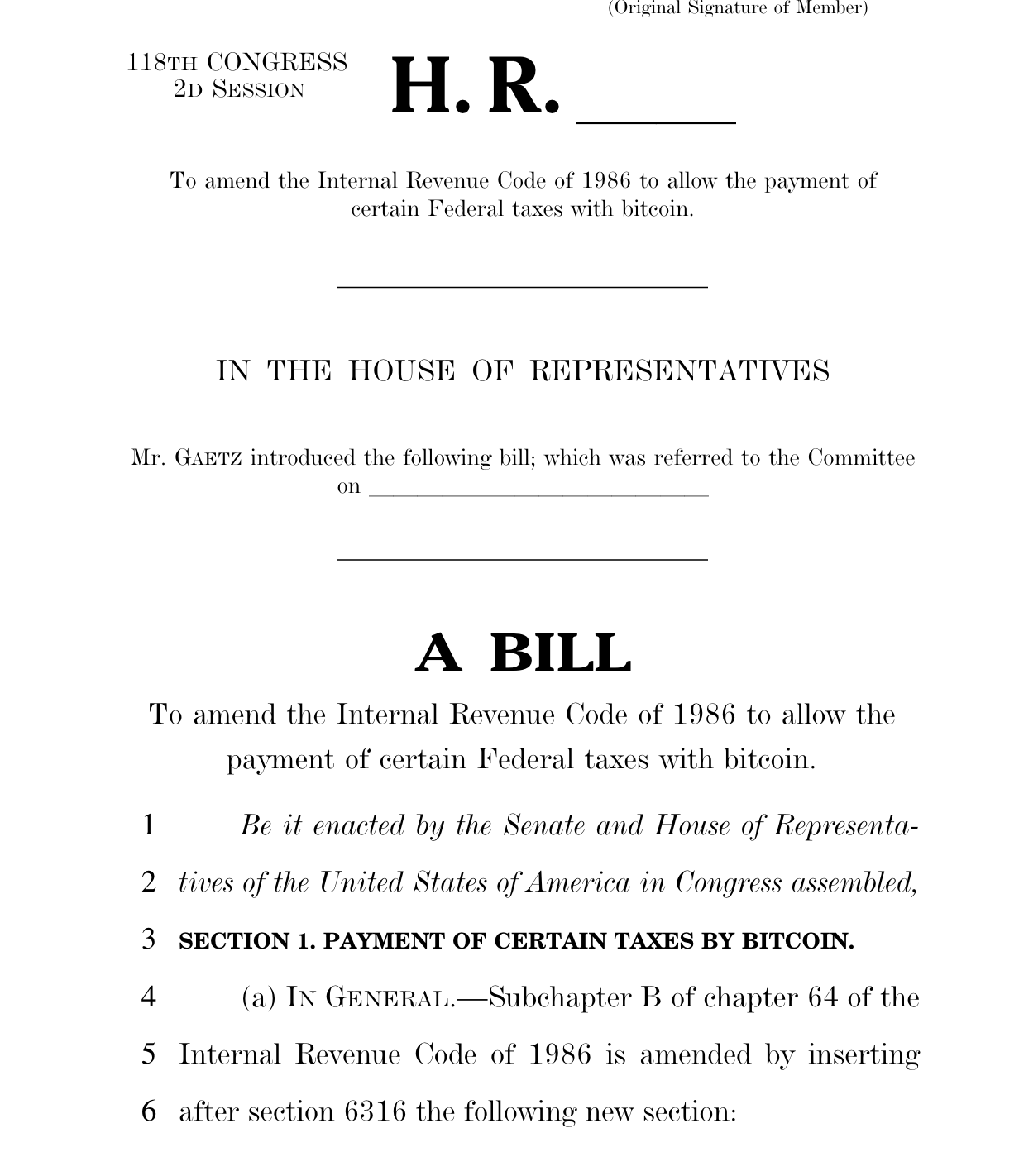 Florida Rep. Matt Gaetz wants the Internal Revenue Code of 1986 amended so that Federal income tax becomes payable in Bitcoin. The bill calls for the Treasury to allow any tax imposed on a taxpayer to be paid with BTC.