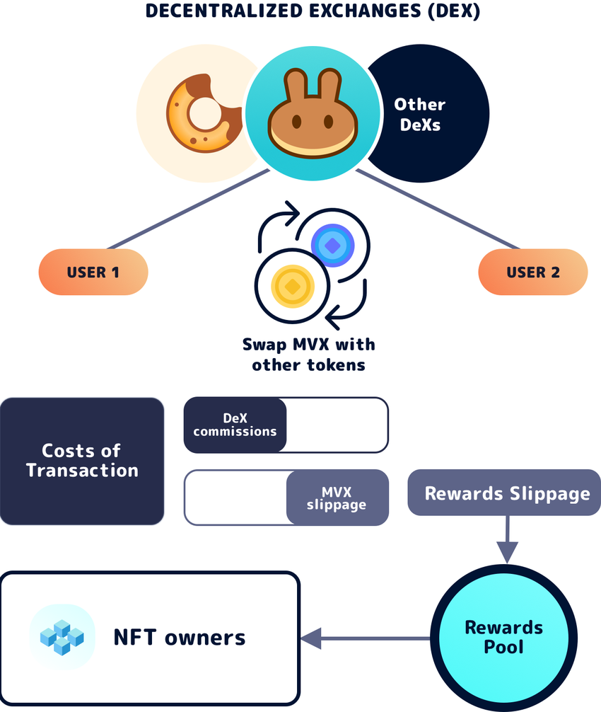The mechanism assigns rewards from a reward pool that picks its balance from an additional 3% slippage added above the normal transactions commissions applied by the DeX itself.