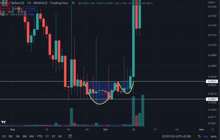 MDX was consolidating tightly between 0.0601 to 0.0632. It then formed a volatility contraction pattern, as shown in the chart below, and gave a strong breakout on Oct. 9. The volumes supported the breakout, and the coin is up by almost 75%