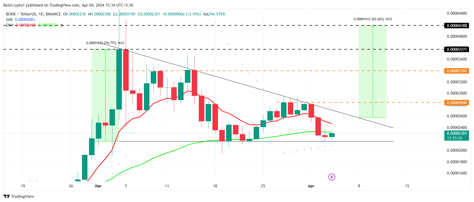 At present, Bonk’s price is showing bullish signs, suggesting a potential recovery is on the horizon. A common hurdle for meme coins is sustaining investor optimism after a correction, as many investors aim for quick gains and typically engage more actively when prices are already on the rise.