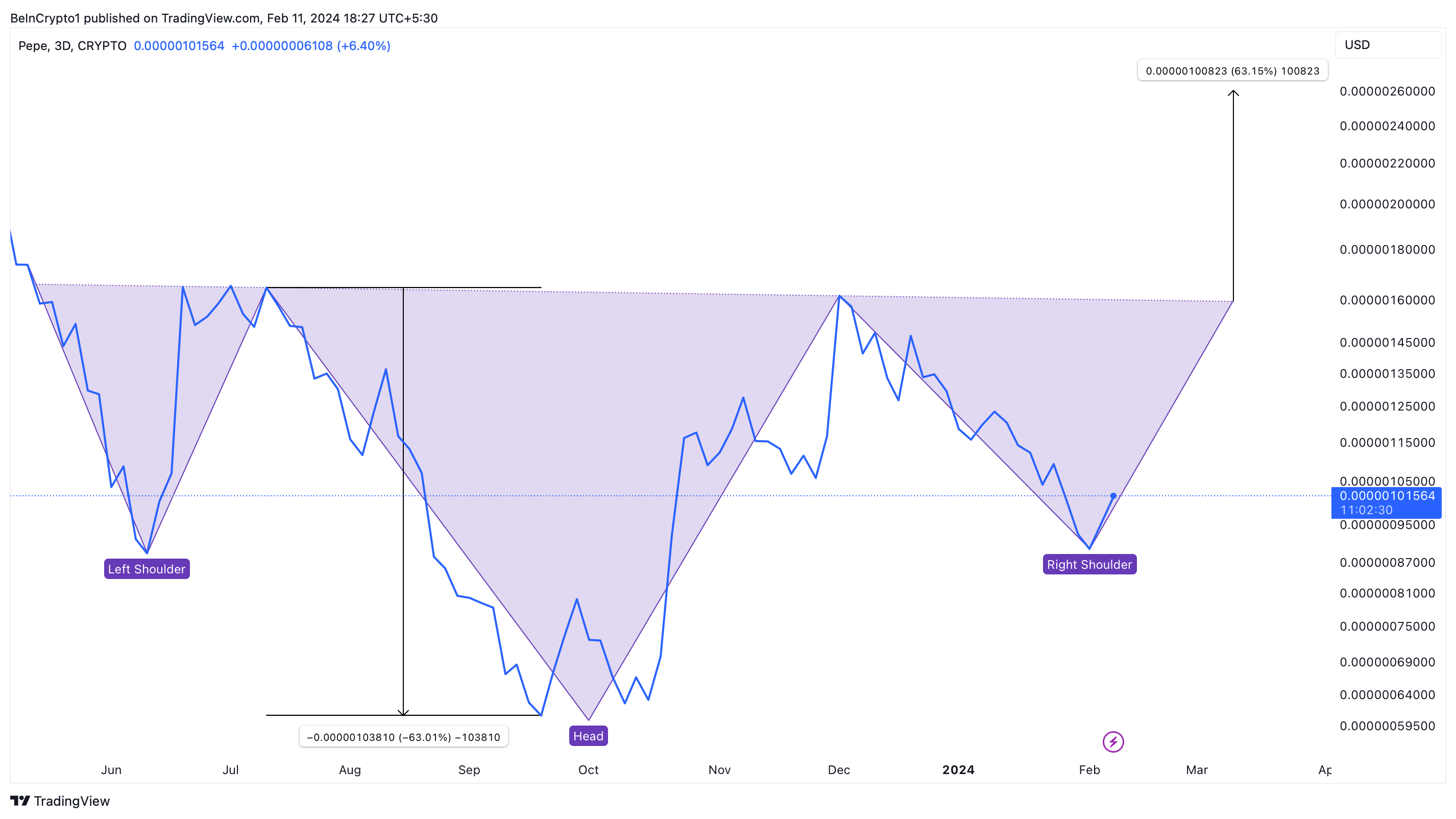 Finally, PEPE, while less known than its counterparts, is not to be underestimated. The coin is currently forming what appears to be the right shoulder of a head-and-shoulders pattern. This is a bullish signal for investors.