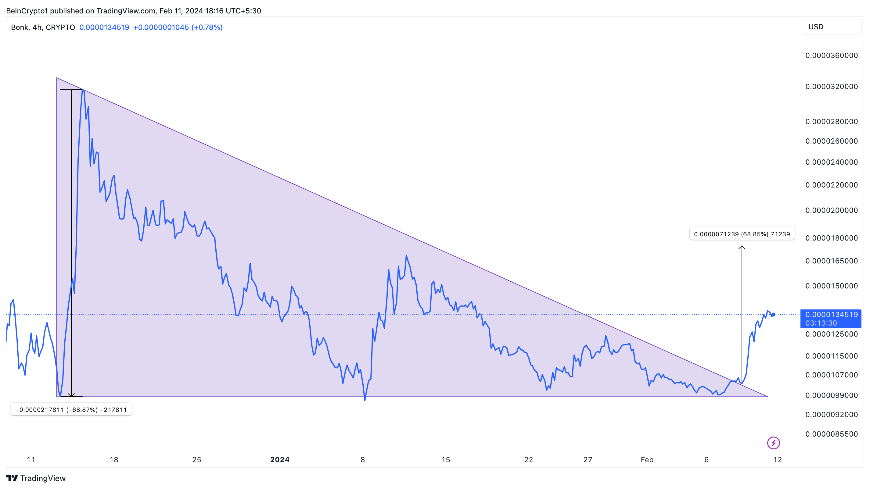 The Solana-based meme coin BONK has seen its value surge by over 30% in the past three days, sparking interest among cryptocurrency investors. The significant bullish price action comes after BONK broke out from a descending triangle on February 9, shifting its market value from $0.0000103473 to a notable high of $0.0000141310.
