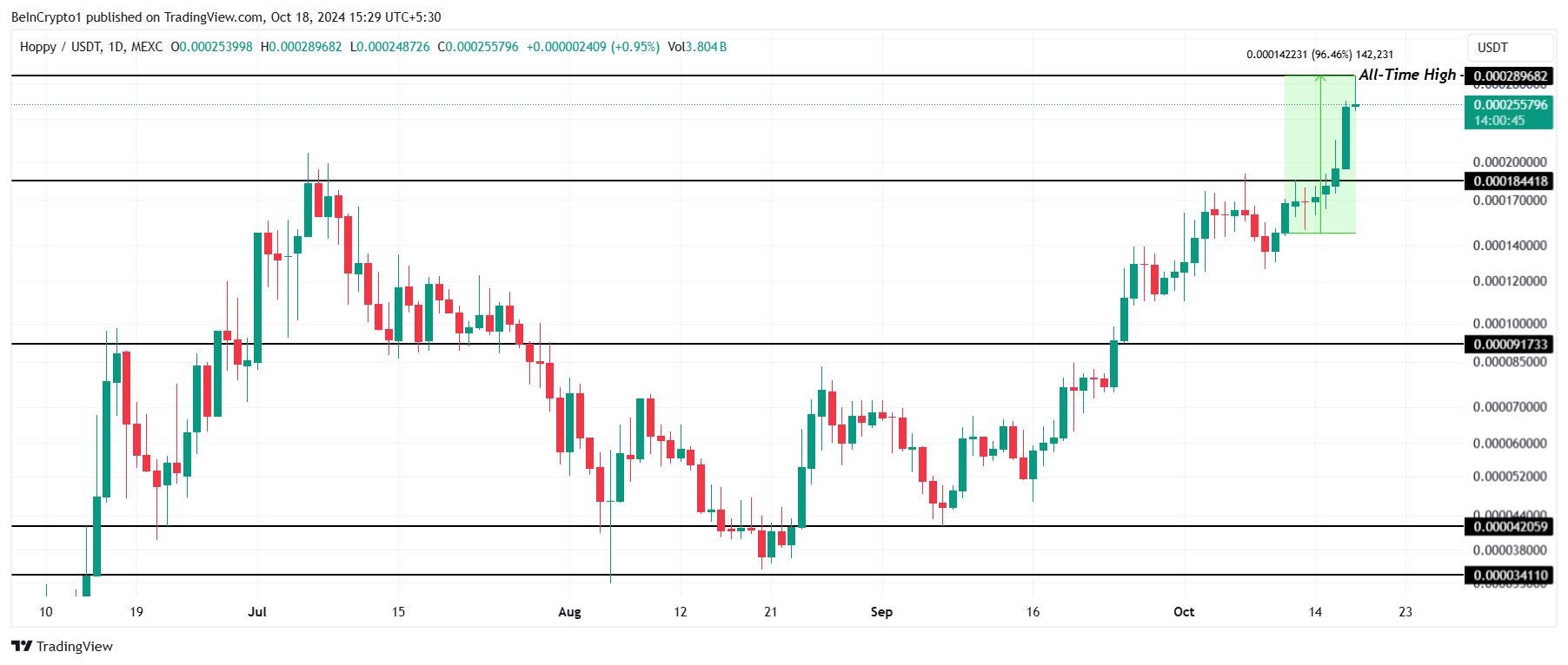 The week-long rally is part of an ongoing uptrend that began in mid-September. Hoppy has managed to break through several key resistance levels during this period, reinforcing its bullish outlook.
