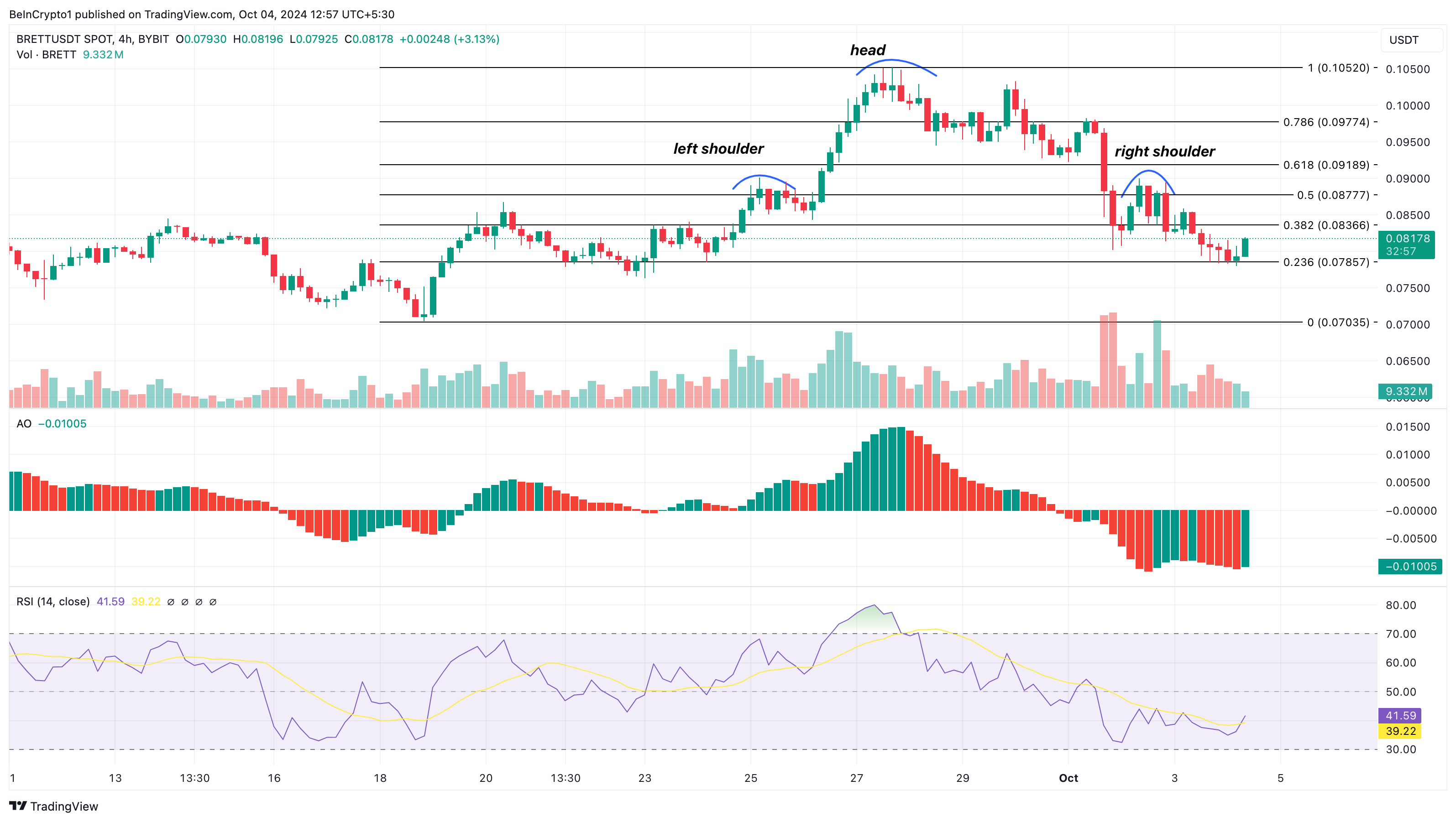 SponsoredAccording to the 4-hour chart, BRETT’s decline was further accelerated by the formation of a head-and-shoulders pattern. This pattern is bullish-to-bearish and ensures the continuation of a downtrend.