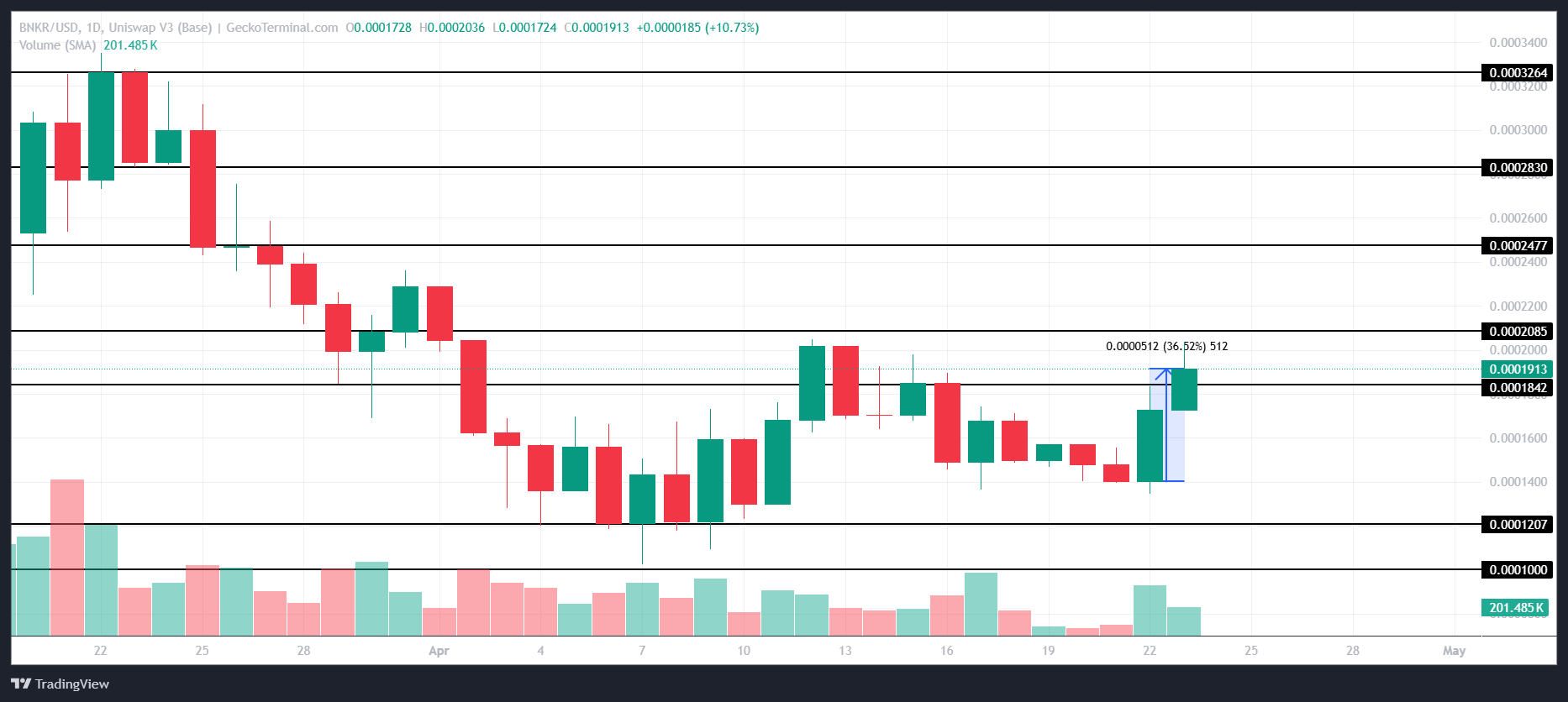 BNKR has surged by 36% in the last 24 hours, making it one of the top-performing tokens in the Clanker ecosystem. Trading at $0.0001913, it is holding just above the support level of $0.0001842, showing strong momentum in the short term. The altcoin remains on an upward trajectory.