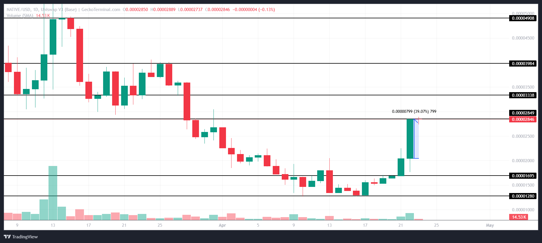 NATIVE price has surged by 39% in the last 24 hours, reaching $0.00002846. The token is just below the resistance level of $0.00002849, showing strong short-term bullish momentum. If this trend continues, NATIVE could aim for higher targets, supported by ongoing market optimism and investor interest.