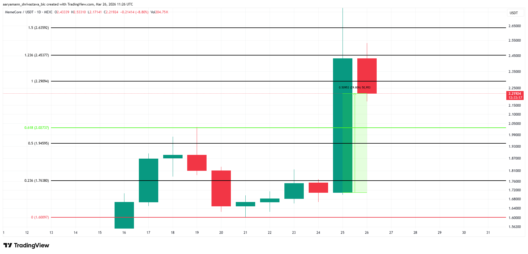 Memecore price opened on March 26 below the 1.236 level after failing to close above it on March 25. The annotated measured move on the chart shows a prior 29.80% gain from the base of the March 25 candle. That move has now partially reversed, with the price at $2.20.