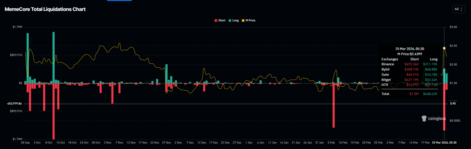 Memecore (M) is trading at $2.20, pulling back 9.25% after the previous session’s explosive rally. The move wiped out $1.7 million in short positions across five exchanges on March 25 alone, but historical price behavior following similar liquidation events suggests the rally is already exhausted.