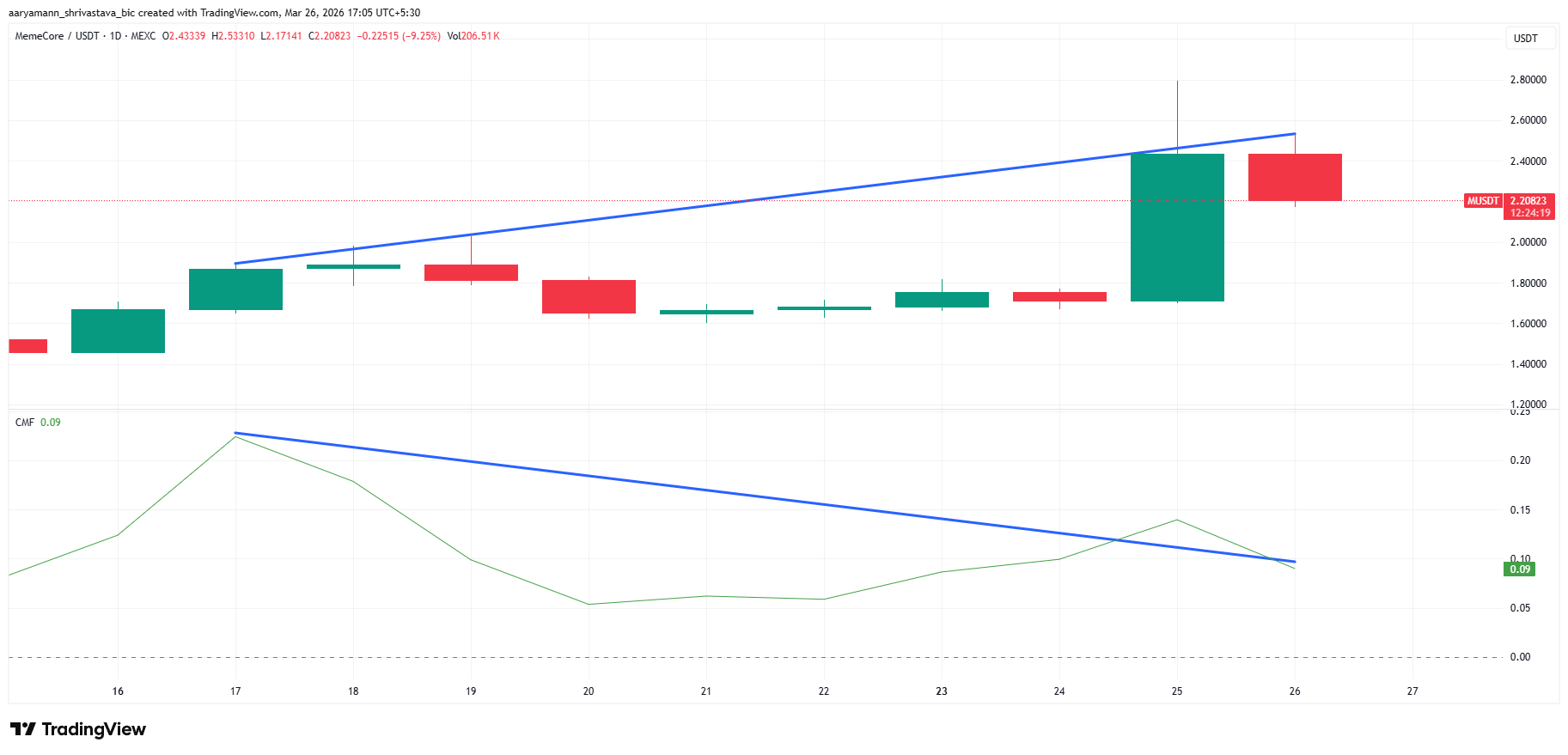 Given the bearish CMF divergence and the consistent post-liquidation reversal pattern visible across the full historical chart, the 0.618 level at $2.02 is the most likely near-term destination. Memecore price daily close below $2.02 would open the path to the 0.5 level at $1.94 and then the 0.236 level at $1.76. The Fibonacci zero at $1.60 remains the last visible floor.