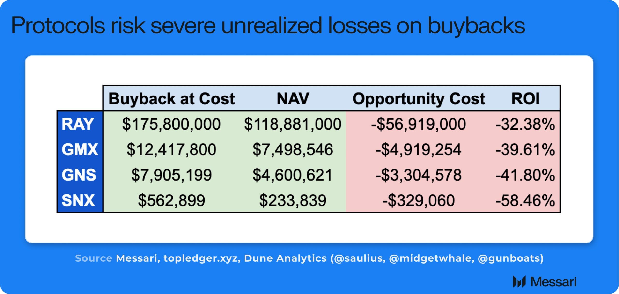 “RAY, GMX, GNS and SNX have programmatically bought back millions in tokens which are now worth way below cost,” Messari’s enterprise research analyst Sunny Shi wrote on X.