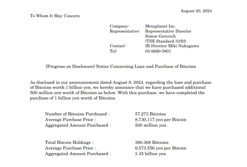 In an August 8 commitment letter, Metaplanet announced plans to purchase 1 billion yen worth of Bitcoin. The latest acquisition fulfills that promise.