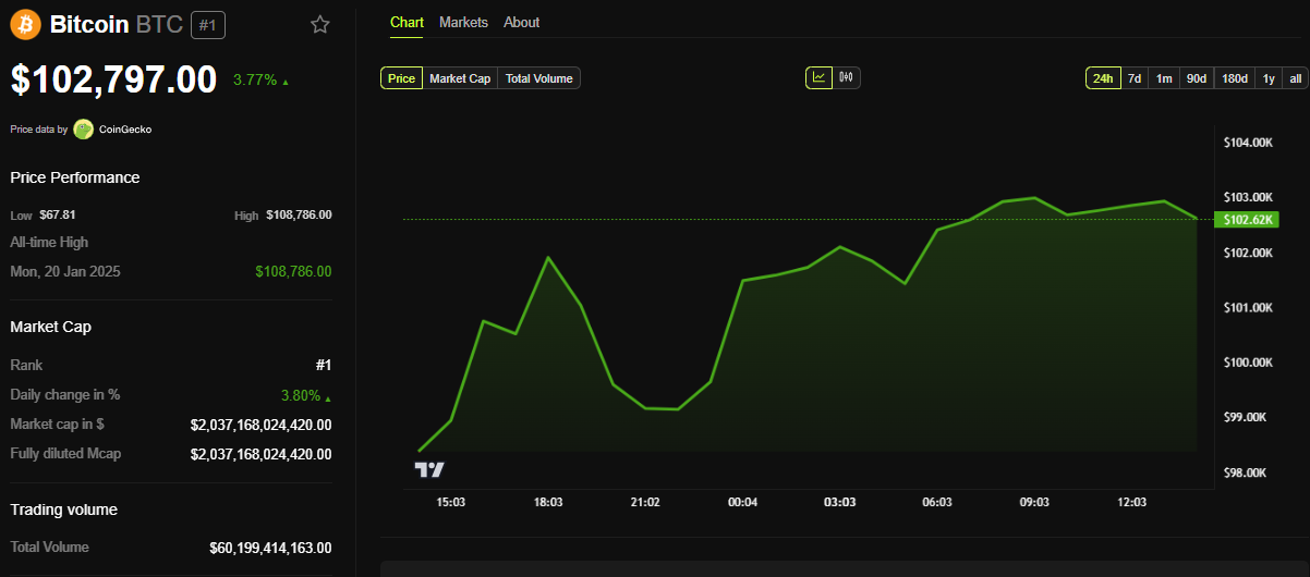 BeInCrypto data shows BTC was trading at $102,797 as of this writing. This represents a 3.77% surge since the Tuesday session opened.