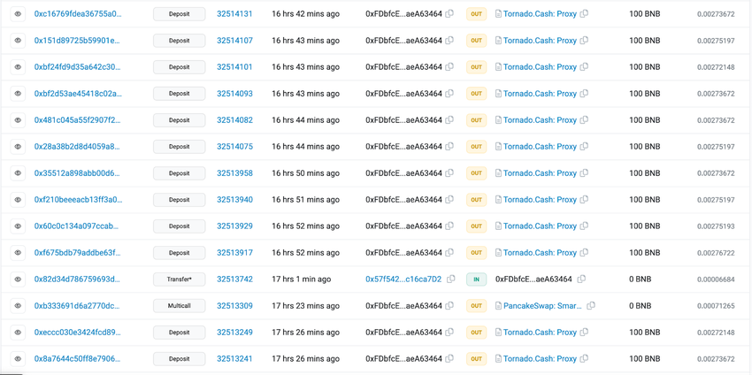After conducting the flash loan attack, the BH token exploiter siphoned off the funds using the crypto mixer Tornado Cash. The screenshot below shows that the wallet sent funds to Tornado Cash in batches of 100 BNB.