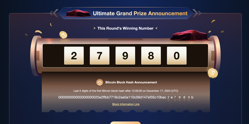 SponsoredMEXC pioneered the use of Bitcoin block hash values to determine the grand prize winner, ensuring unparalleled transparency and fairness in the process. The coveted grand prize, a luxury supercar valued at 500,000 USDT, was awarded to the lucky participant whose ticket number (05980) was the closest to the final five digits (27980) of the hash of the first Bitcoin block generated after 20:00:00 UTC+8 on December 17, 2024. Other exciting prizes included coveted Rolex watches, luxurious Louis Vuitton products, and Apple MacBooks.