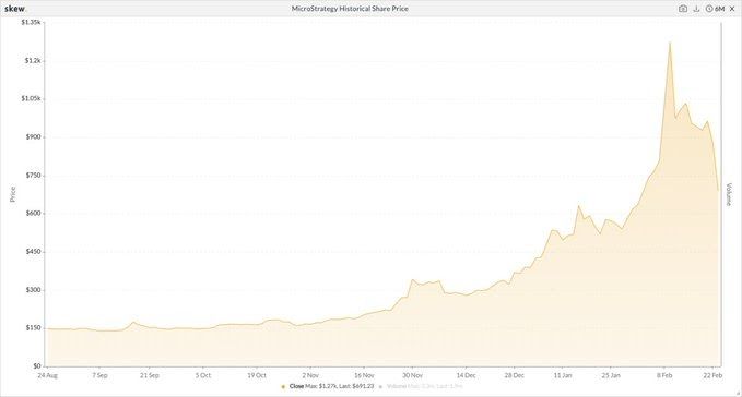 This news comes as the price of MicroStrategy’s ($MSTR) stock has fallen nearly 50% from its peak on Feb. 9, according to data from skew.