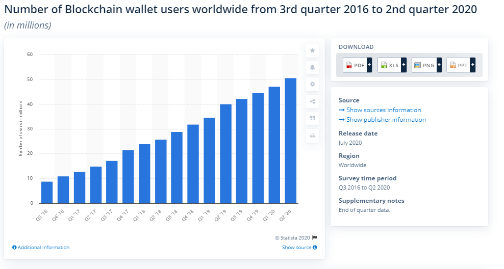 Still, it represents a useful start on the journey there, so we could start by looking at this chart showing how many blockchain wallets — including Bitcoin and every other cryptocurrency — currently exist.