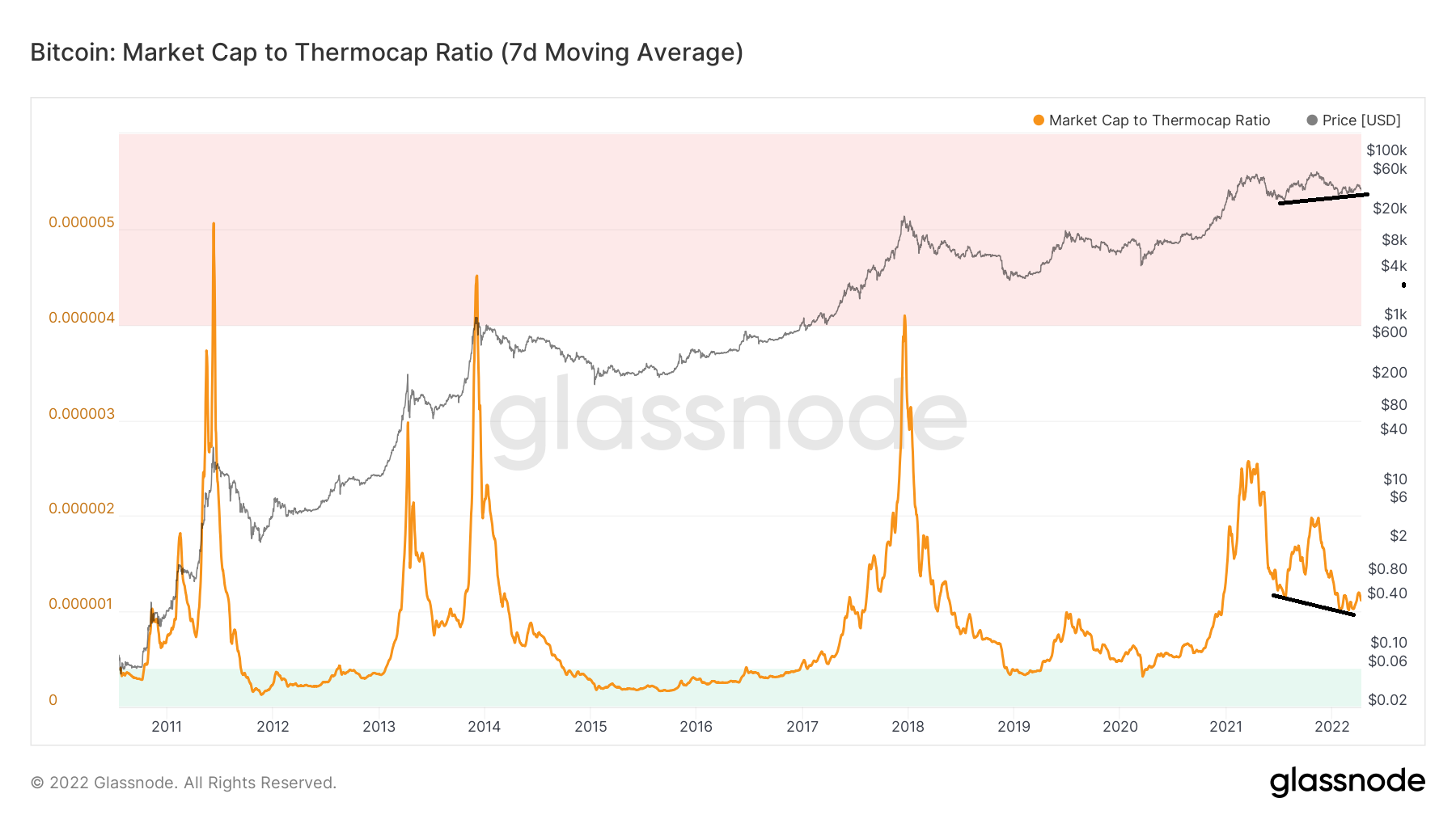The market cap to Thermocap ratio is an on-chain metric that measures the market value of BTC relative to miner spending. In a nutshell, it measures if BTC is at a premium or discount in comparison with the total amount that miners have spent.