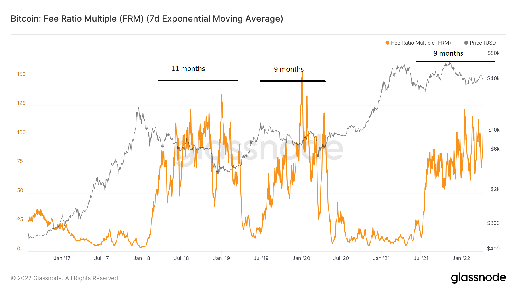 The Fee Ratio Multiple (FRM) is the ratio between miner revenue and transaction fees. It is a way to measure how secure the blockchain is if block rewards were to come to an end.