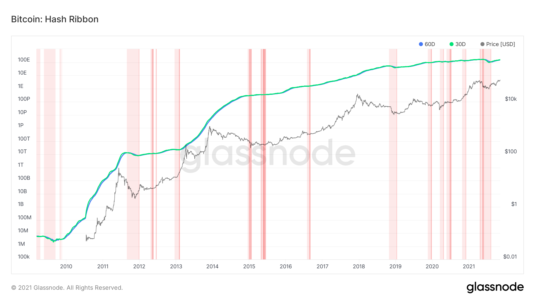 The hash ribbon indicator makes use of the hash rate in order to determine if miners have capitulated. Miner capitulation occurs when the mining costs are higher than rewards. This can be better seen by adding a 30 and 60-day MA to the hash rate.
