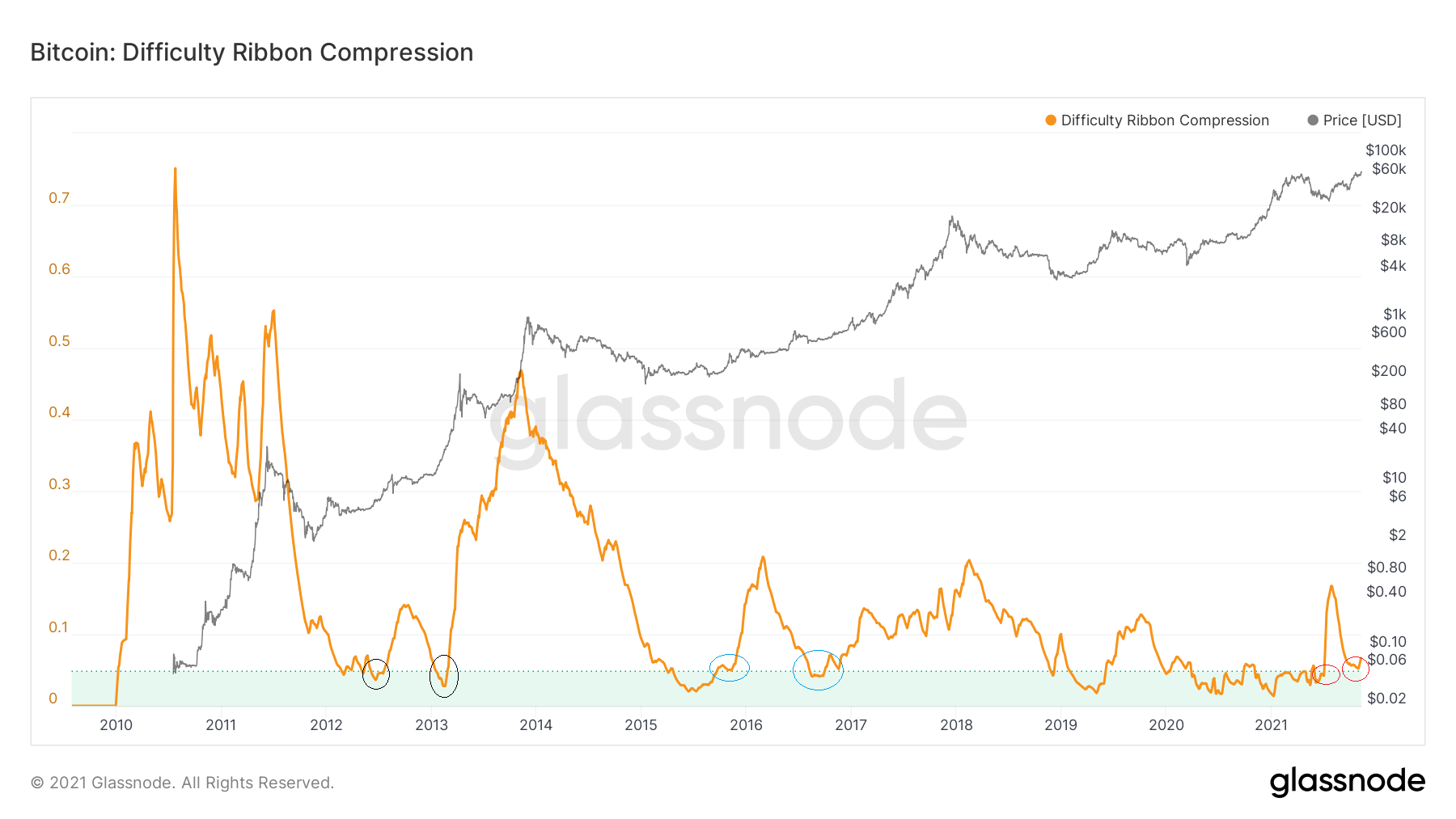 The difficulty ribbon is an on-chain indicator that uses moving averages (MA) of bitcoin mining difficulty. The difficulty ribbon compression adds a standard deviation to this indicator. Historically, values between 0.01 and 0.05 (highlighted in green) have indicated bottoms.