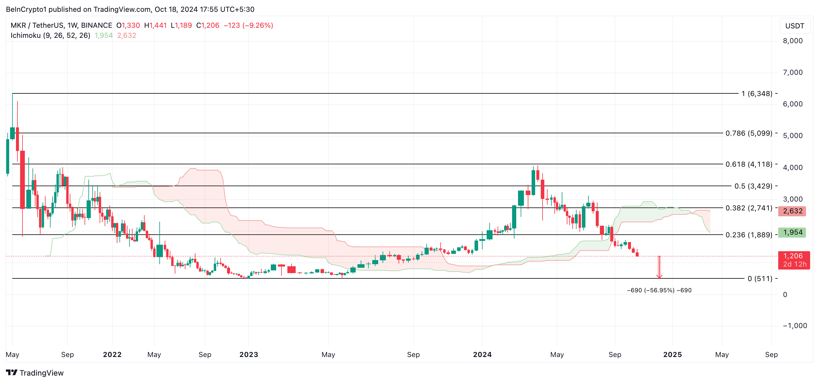 As of this writing, MKR is trading at $1,206. Based on readings from the altcoin’s Fibonacci Retracement tool, with the increasing selling pressure, MKR’s price could fall toward $511, marking its lowest level since May 2023.