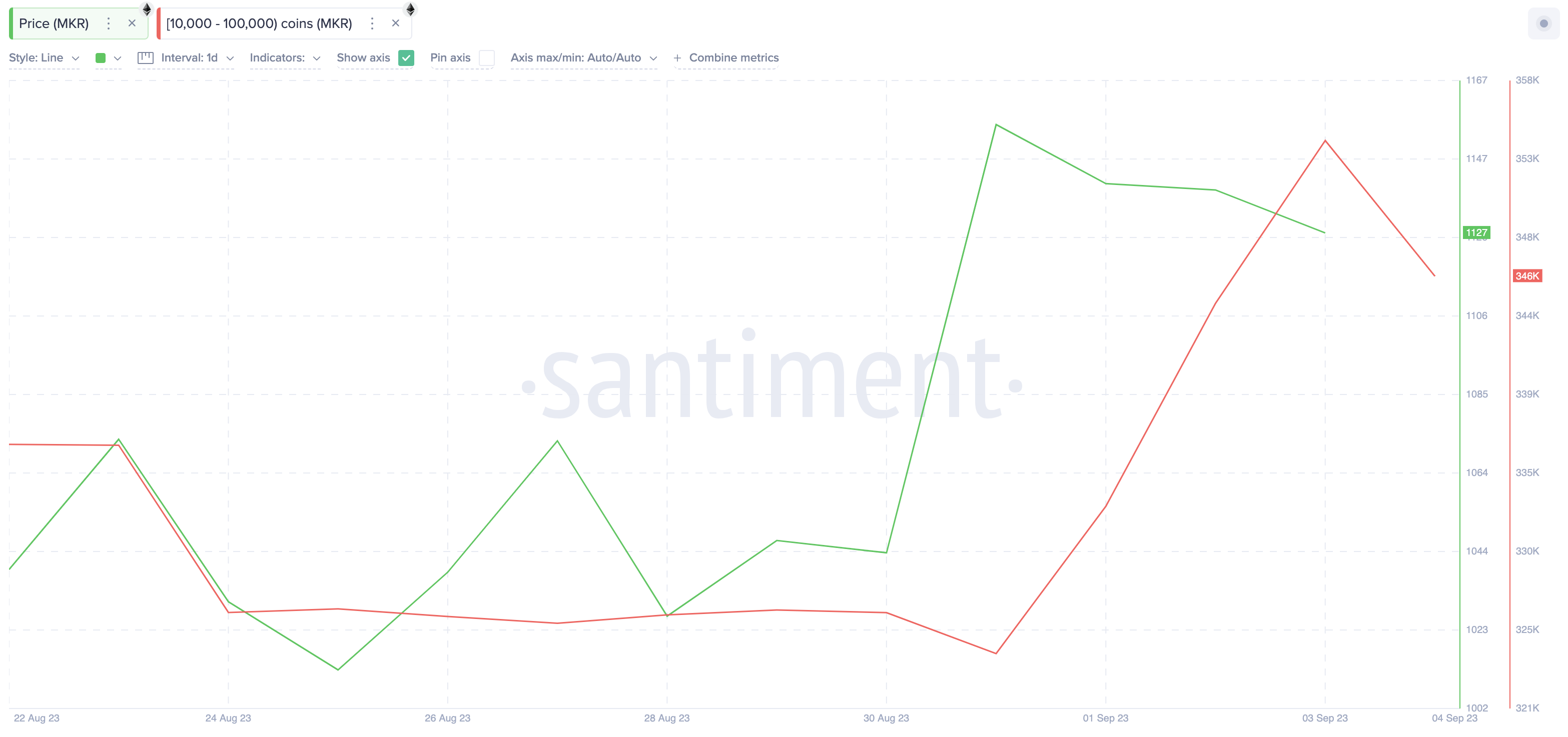 On Sept 1, a day before Vitalik’s controversial transaction, crypto whales holding 10,000 to 100,000 MKR had only 333,000 tokens in their cumulative balances. But as shown in the chart below, they have now increased their balance to 346,000 MKR.