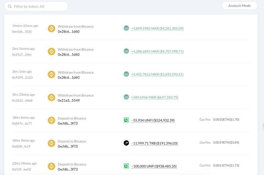 As depicted below, the whale address moved a total of 11,231 MKR tokens, worth approximately $12.3 million, from Binance over a period of 4 hours.