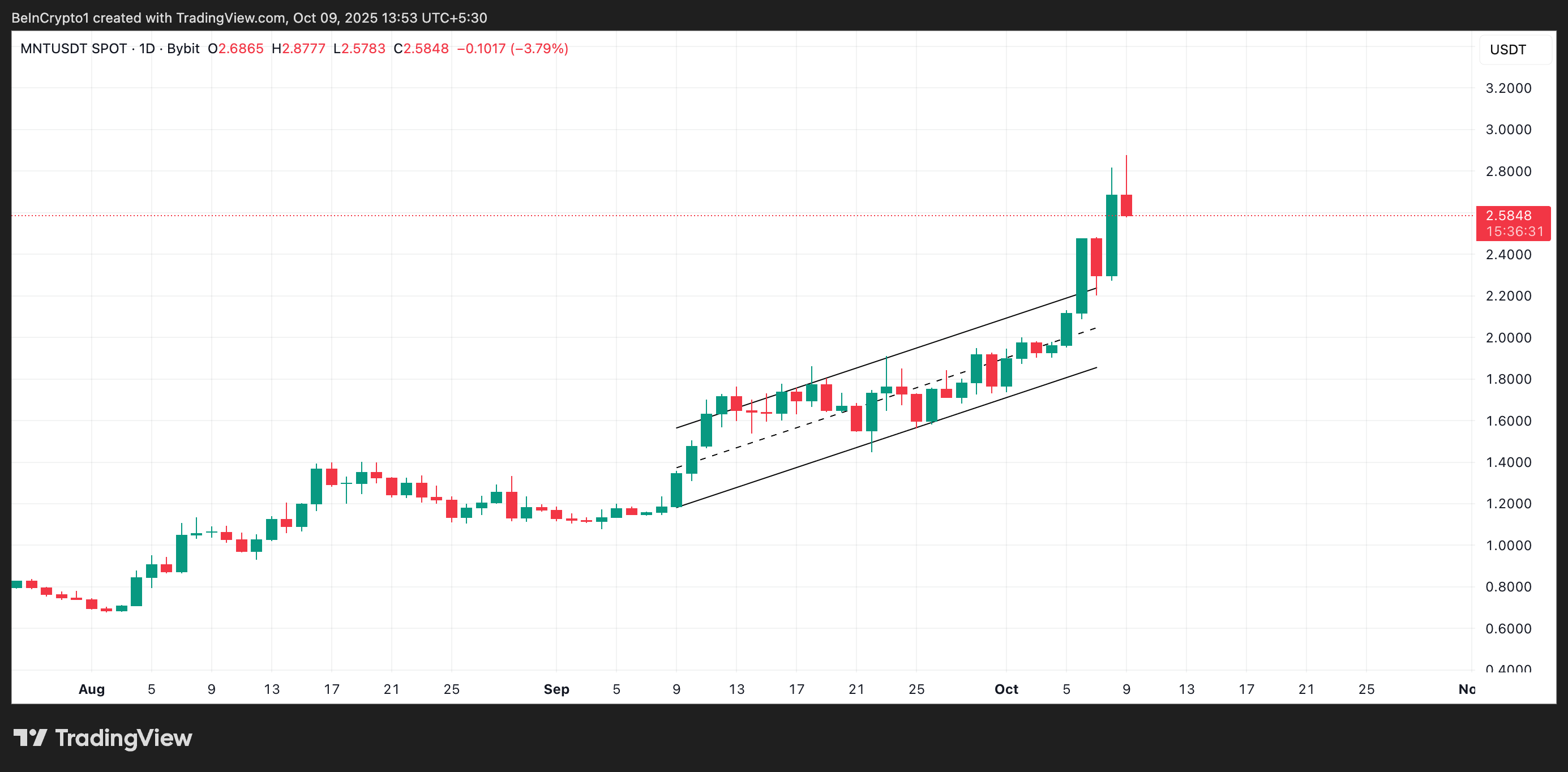 MNT’s upward price momentum is evident on the daily chart, where the token now trades above its ascending parallel channel.