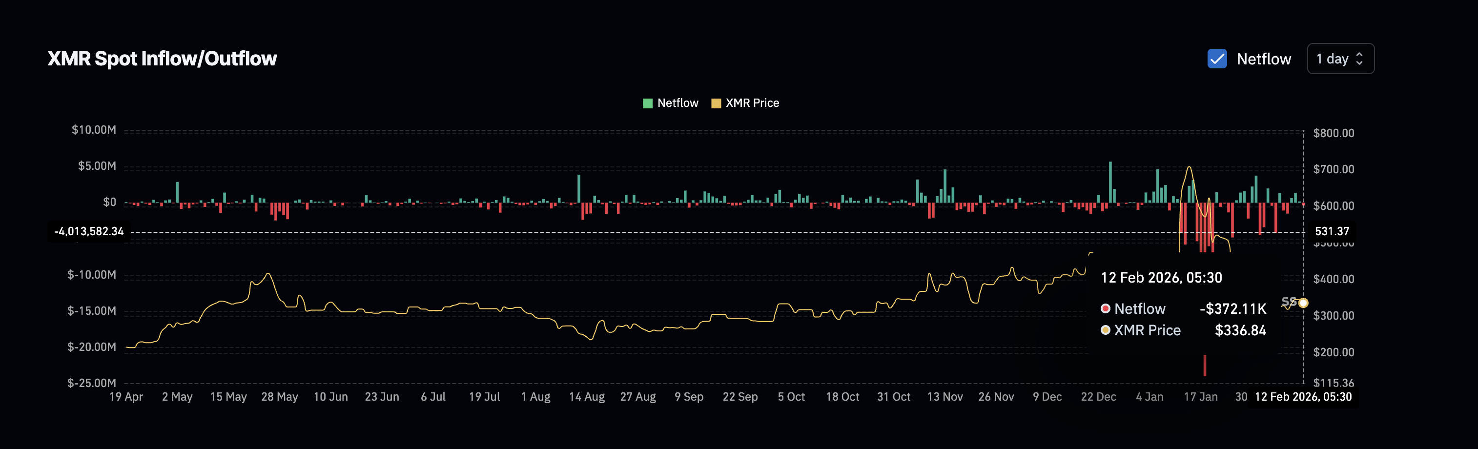 Exchange flow data supports this view. After three days of mild inflows, Monero recorded net outflows again on February 12, with around $372,000 worth of XMR moving out of exchanges. Negative netflow usually signals rising buying pressure.