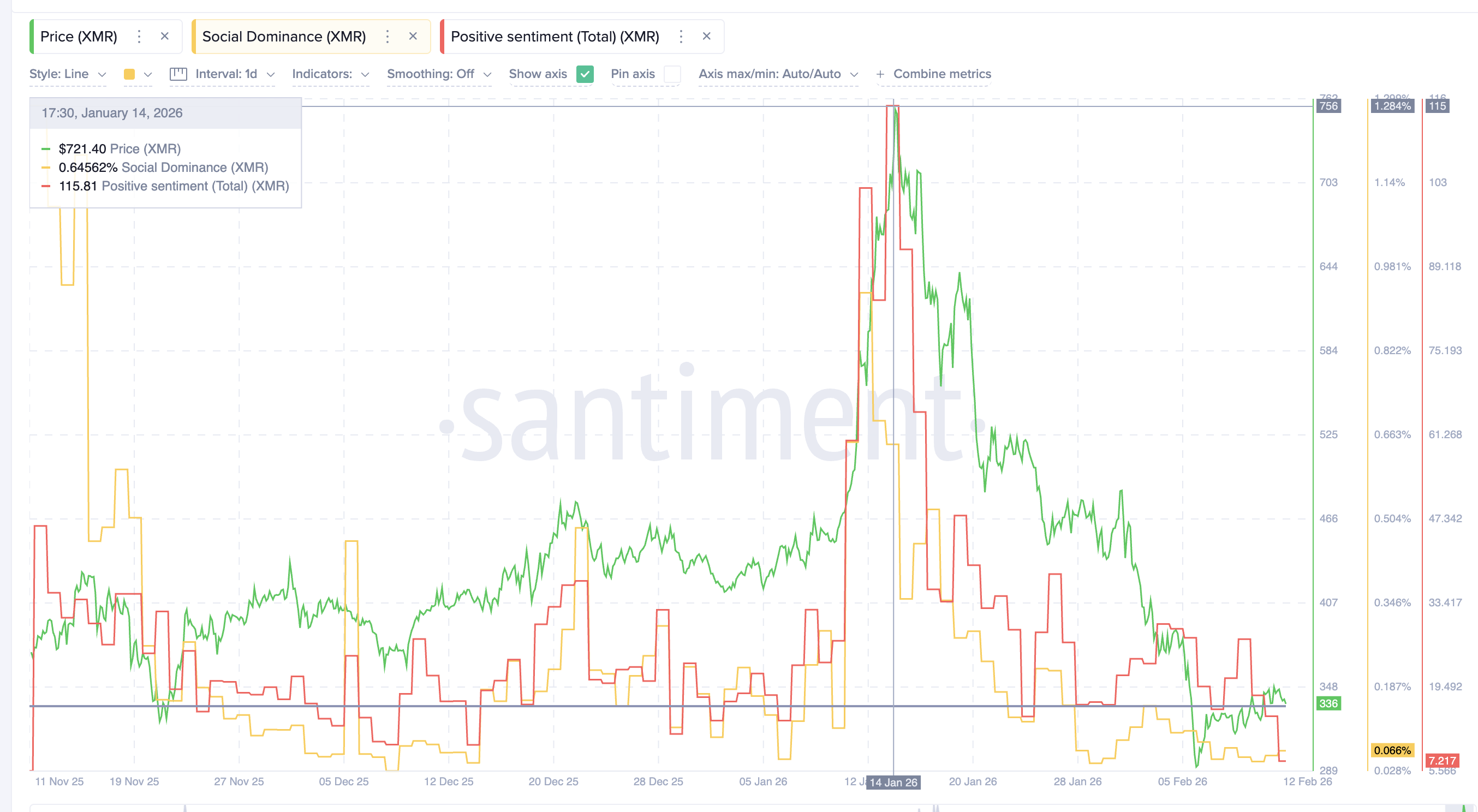For example, on January 12, social dominance surged near 0.92%. Within two days, Monero rallied 25%. A similar pattern appeared on January 18, when social interest rose ahead of another short-term price peak. However, the current rise in social dominance is much weaker than in those past cases. It remains well below the February high near 0.106 and far below January’s major spikes.