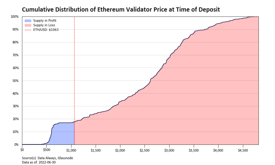 A Glassnode chart from June 30 confirms that non-genesis stakers are now in the red. However, the chart only shows the price of ETH at the time of staking, not at the time of purchase, so those figures could be skewed somewhat.